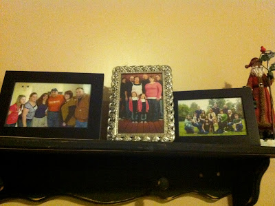 While I was ordering pictures from Wal Mart, I decided to order 6 4x6 prints to update the pictures on our shelf (also in the same room, opposite wall). We have the blocks that say "Family" and 6 different frames with pictures in them. Before, they all had pictures of us - mostly engagement pictures. Now they have pictures of our family in them!